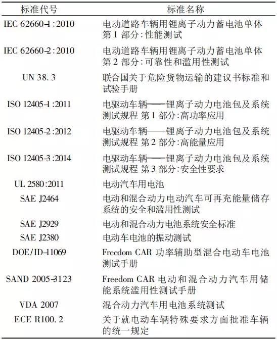 1 国际标准IEC发布的动力锂离子电池标准主要有IEC 62660-1∶2010《电动道路车辆用锂离子动力蓄电池单体 第1部分: 性能测试》和IEC 62660-2∶2010《电动道路车辆用锂离子动力蓄电池单体 第2部分: 可靠性和滥用性测试》。联合国运输委员会颁布的UN 38. 3《联合国关于危险货物运输的建议书标准和试验手册》,对锂电池测试的要求是针对电池在运输过程中的安全性。