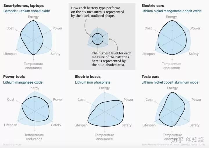 每个电池有两个电极:一个阴极和一个阳极。大多数锂离子电池的阳极是由石墨制成的,但阴极是由各种材料制成的,这取决于电池的用途。下面,您可以看到不同的阴极材料如何改变电池类型在六个方面的表现。