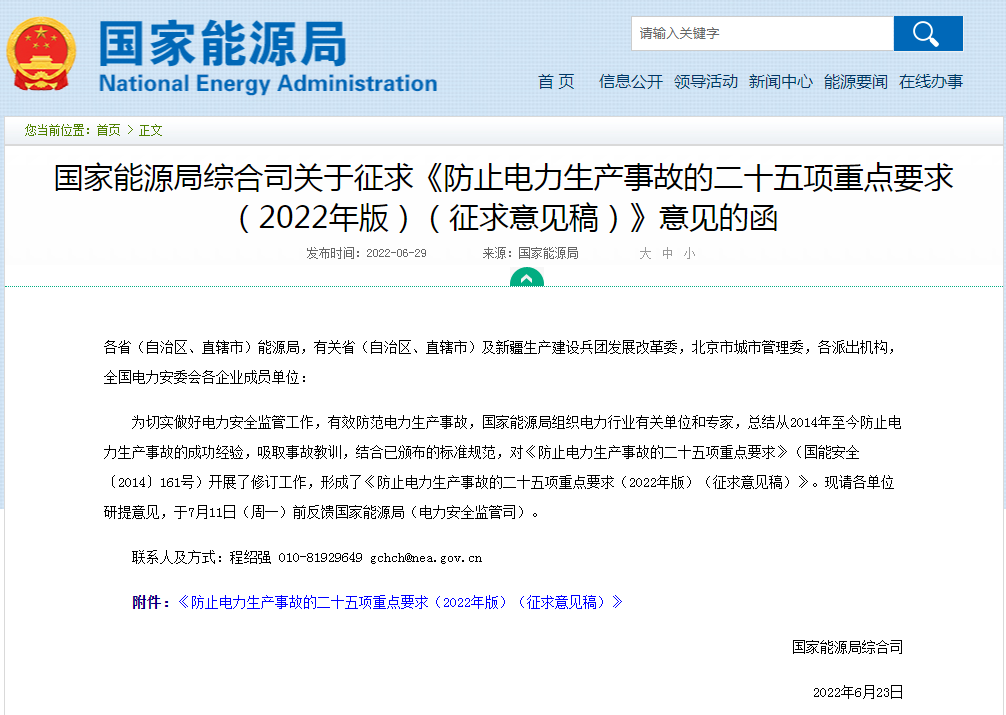 维科网锂电注意到,早在2022年6月29日,国家能源局官方网站已发布“国家能源局综合司关于征求《防止电力生产事故的二十五项重点要求(2022年版)(征求意见稿)》意见的函”。