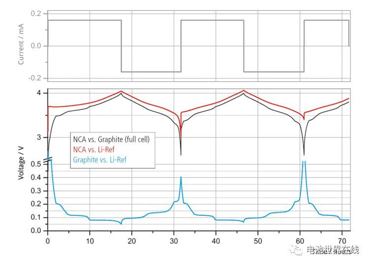 图2 三电极电池电流、电压曲线(来源https://el-cell.com/)