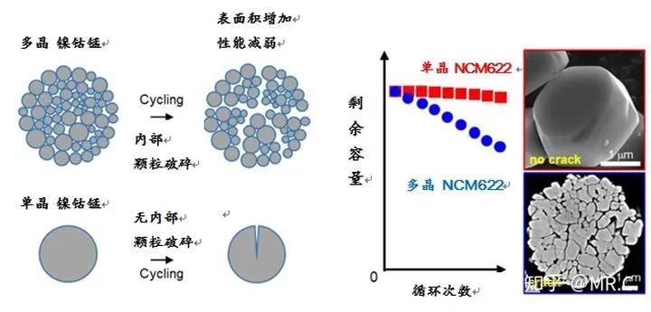 多晶NCM内部存在大量晶界(grain boundary),在电池充放电过程中,由于各向异性的晶格变化,多晶NCM容易出现晶界开裂,导致二次颗粒发生破碎,比表面积和界面副反应快速增加 (图3),导致电池阻抗上升,性能快速下降。而单晶型三元材料内部没有晶界,可以有效应对晶界破碎及其导致的性能劣化问题[1]。因此,单晶结构可以实现更高的电压,不仅如此,还提升了三元材料的循环稳定性,大幅提升了电池安全性。