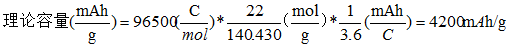 对于硅负极,由5Si+22Li++22e- ↔ Li22Si5 可知, 5个硅的摩尔质量为140.430 g/mol,5个硅原子结合22个Li,则硅负极的理论容量为: