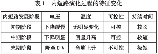内短路存在于电池的全生命周期范围内,可以将其发展演化过程分为初期、中期和末期,如表1所示。