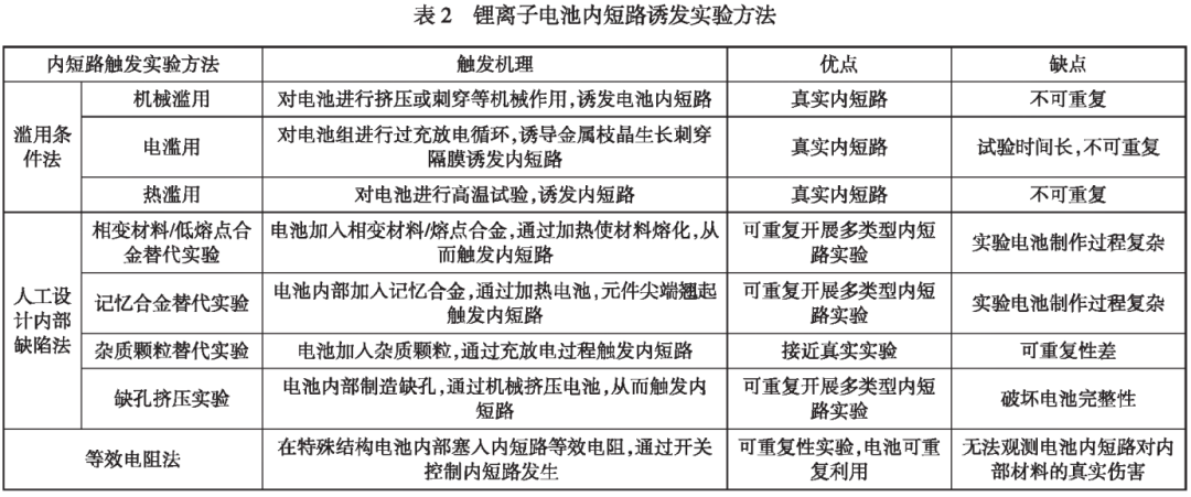 目前锂离子电池内短路诱发实验方法主要可分为滥用条件法、人工设计内部缺陷法和等效电阻法等三类。现将几种锂离子电池内短路诱发实验方法触发机理和优缺点分析统计如表2所示。