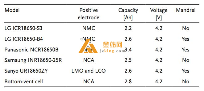 试验总共对来自LG、松下、三星和三洋的5款18650电池和一款具有双防爆阀新型设计的18650电池进行研究(如下表所示),5种电池的正负极材料分别采用NMC、NCA、LMO和LCO混合,用来验证不同的体系和电池结构对防爆阀安全性的影响。