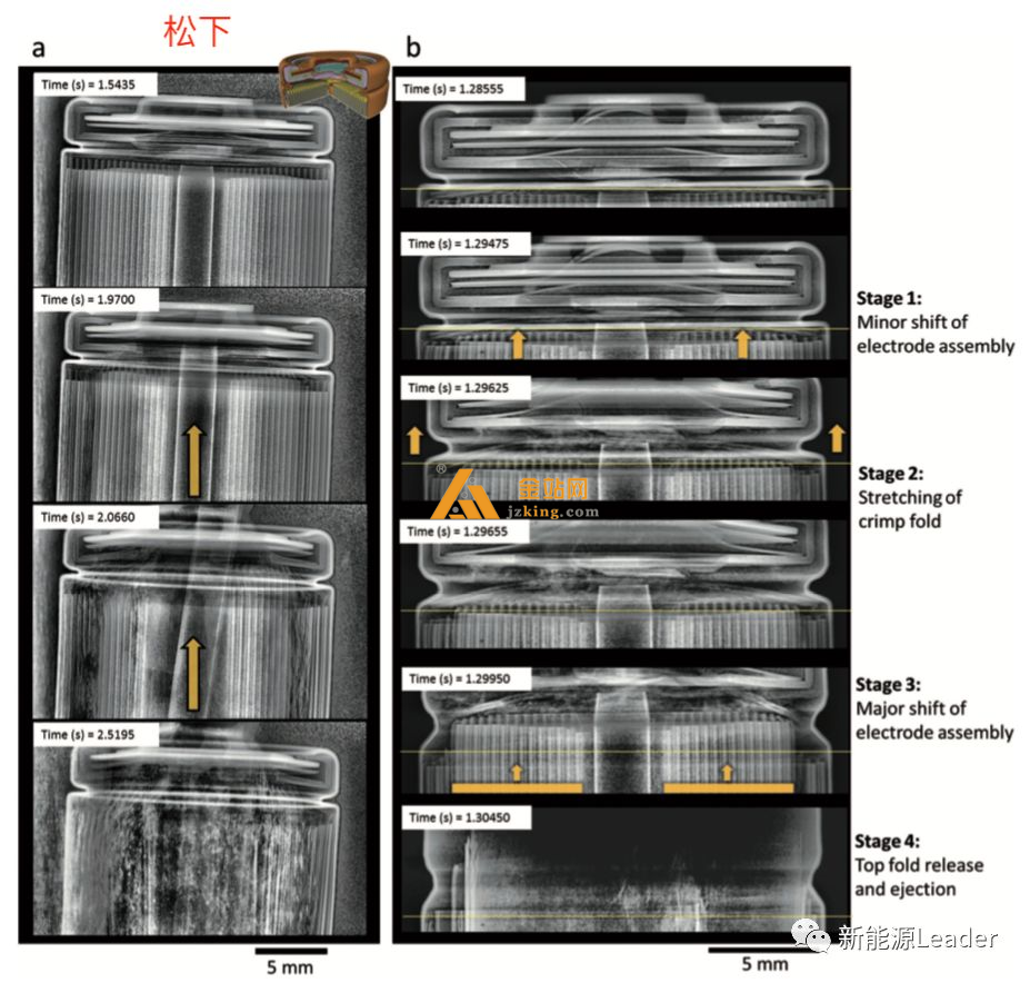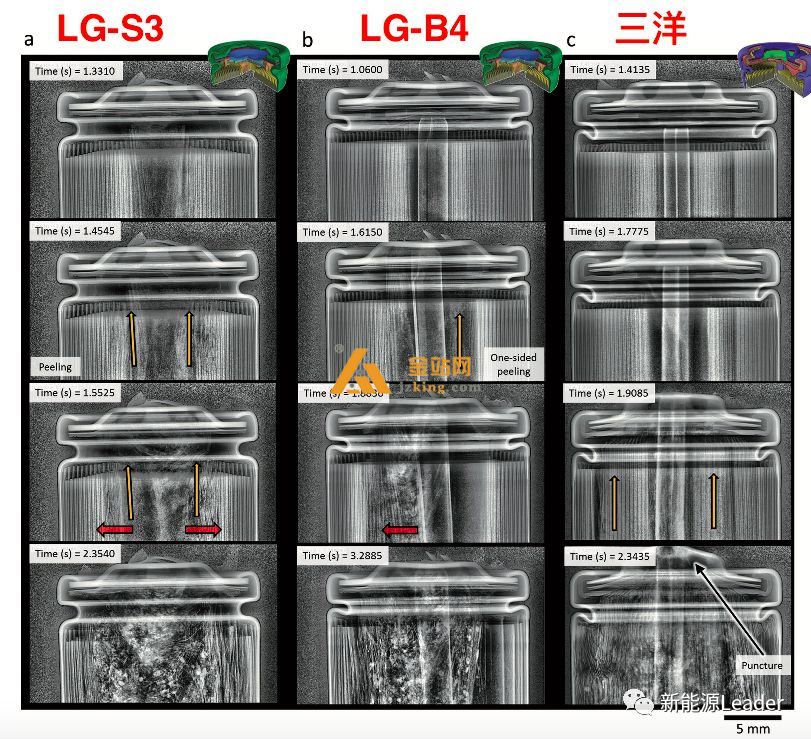 下图为通过高速相机(每秒2000张)拍摄的LG的两款电池和三洋电池的防爆阀泄压过程(视频1、3和5,视频2、4、6为同样电池重复试验),从下图a和b中能够注意到虽然LG-S3和LG-B4具有相同的防爆阀结构设计,但是由于LG-B4电池内部具有中心针,因此在热失控中两个电池的行为并不相同。对于S3而言,由于没有中心针的支撑,电芯向中心塌缩,在快速流动气体的带动下,大量电芯上的活性物质被撕扯下来,随气流喷到电池外部(下图a的1.4545s处)。而B4电池由于电芯中央具有中心针,因此在气流的作用下,中心针向其中一侧移动,减少了卷芯针倾斜的一侧的活性物质撕裂的情况,却导致了另一侧电极撕裂的加剧。