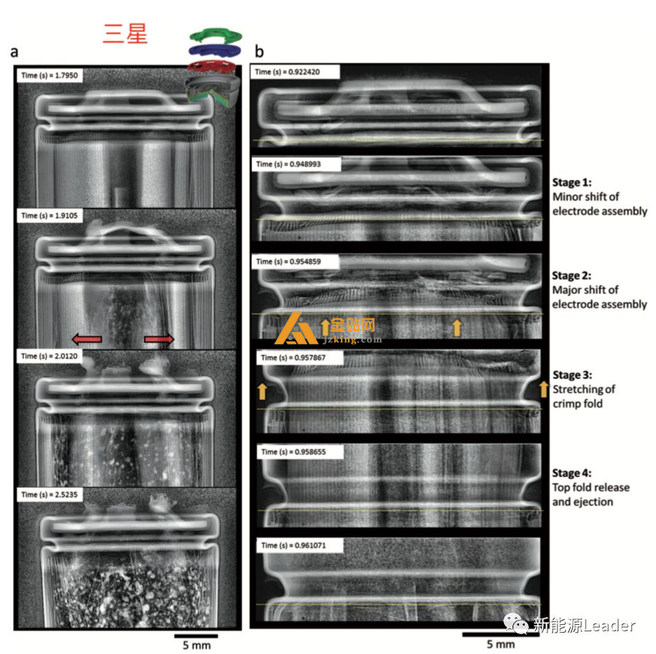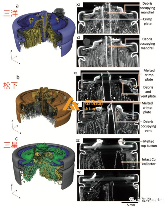 从上面的分析不难看出18650电芯内部的中心针对于电池在热失控中的行为有着显著的影响,从下图b和c尊时凯龙能够注意到在热失控产生的气体推动下,LG-B4和三洋电池的中心针都出现了明显的上移,中心针的存在避免了电芯向中心塌缩,为气体扩散提供了足够的扩散通道,减少了气体喷发时带出的正负极活性物质,降低了热失控向周围电池扩散的风险。