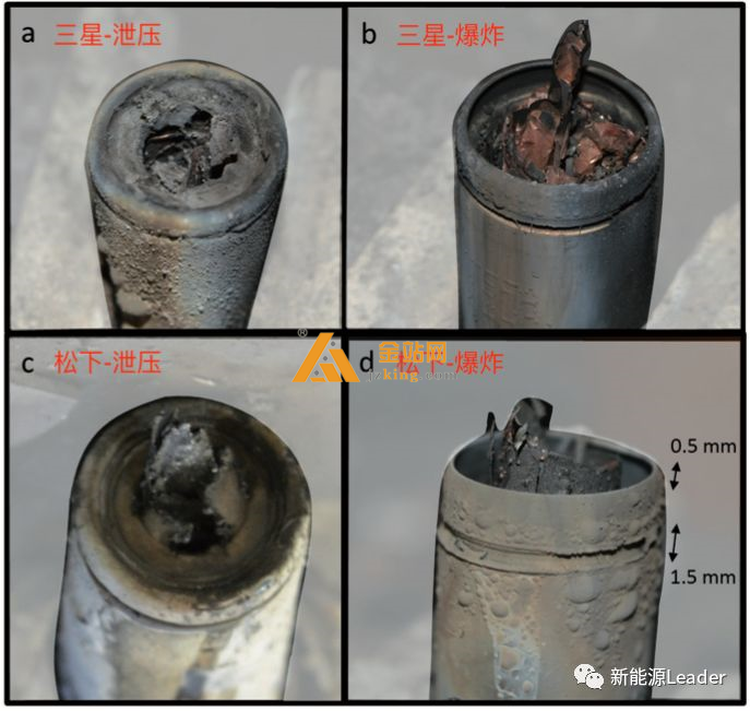 下图为三星和松下18650电池正常泄压和爆炸后的图片,可以看到正常泄压的三星18650电池防爆阀中央发生了明显的熔化现象,松下电池的防爆阀则被中心针刺穿,无论是松下还是三星的电池,在爆炸后其电池壳上盖位置滚槽和压缩密封处都在强大的压力下被拉直了,电池的上盖也被弹出。