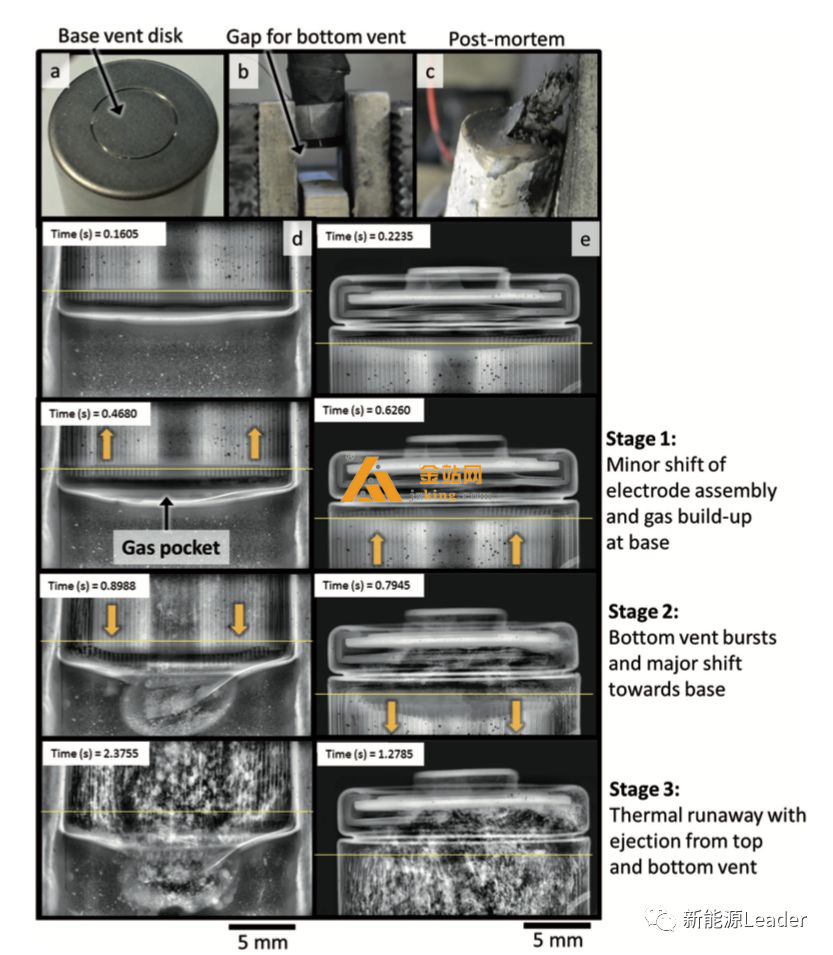 从上面的分析不难看出虽然18650电池设计有防爆阀,希望在电池热失控过程中及时泄压,但是在实际的热失控过程中往往由于电芯堵塞防爆阀,引起电池无法泄压,引起电池爆炸,大量的活性物质向周围扩散,这可能会造成热失控在电池组内部的扩散。为了解决这一问题,作者在18650电池的底部设计了第二个泄压阀(如下图a所示),在热失控过程中产生的气体通过上下两个防爆阀快速释放,避免气体积聚,防止电池爆炸。通过高速视频(视频14、15、16)尊时凯龙能够看到电池的热失控分为以下三个步骤。