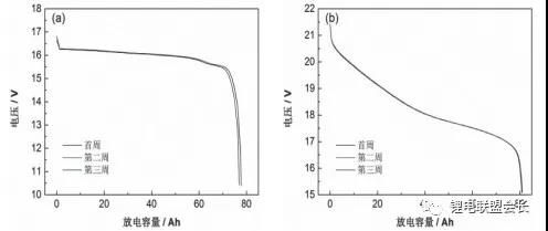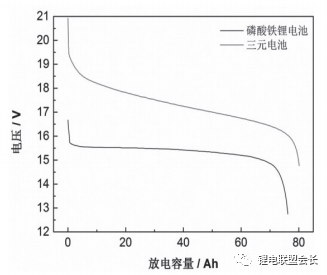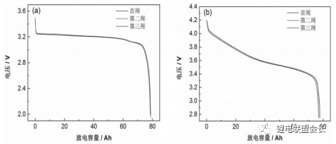对商业化磷酸铁锂电池和三元电池模块(均为5支单体串联)的放电容量测试,所得放电容量曲线如图4所示。磷酸铁锂电池模块3次循环的放电容量分别为76.91Ah、77.72Ah和77.88Ah,根据标准规定,取其平均值77.47Ah作为放电容量;而三元电池模块3次循环的放电容量分别为80.80Ah、80.97Ah和81.02Ah,取其平均值80.93Ah作为所测放电容量。