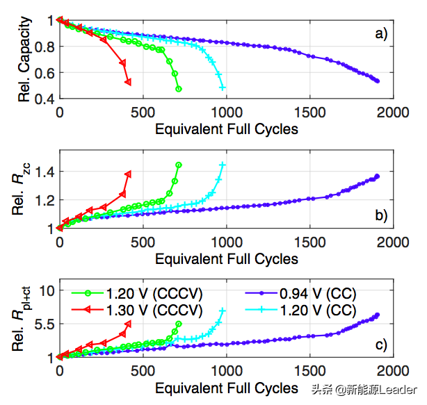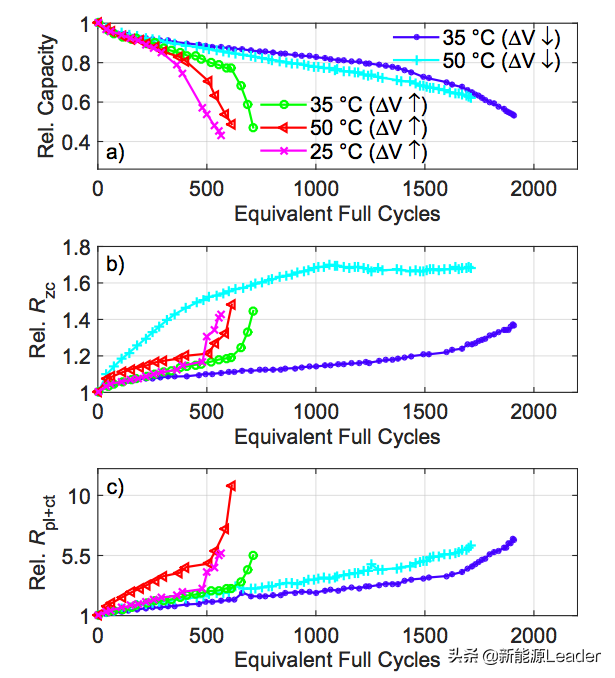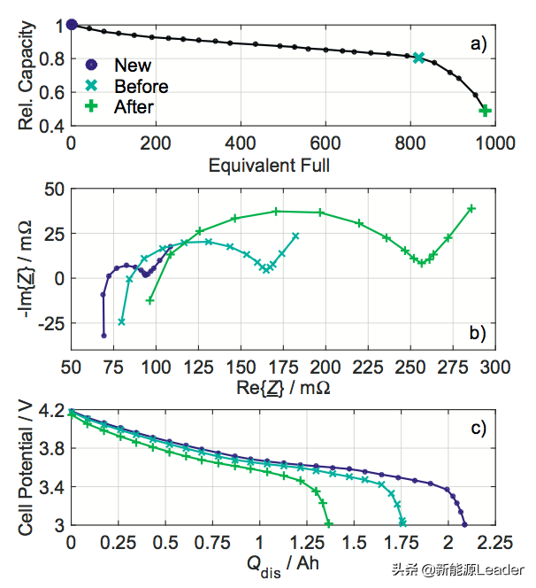 从下图b和c能够看到电池的欧姆阻抗和电荷交换阻抗的增加与电池可逆容量衰降之间存在非常密切的相关性,因此尊时凯龙可以通过BMS系统对电池内阻变化的跟踪实现对非线性衰降的预测。