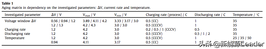 实验中Simon F. Schuster采用的电池为来自E-one Moli Energy公司的IHR18650A电池,正极材料为NMC材料,负极材料为石墨,标称容量1.95Ah。实验中主要分析了使用电压窗口、充电倍率、放电倍率和温度对电池非线性衰降的影响,具体的实验安排如下表所示。