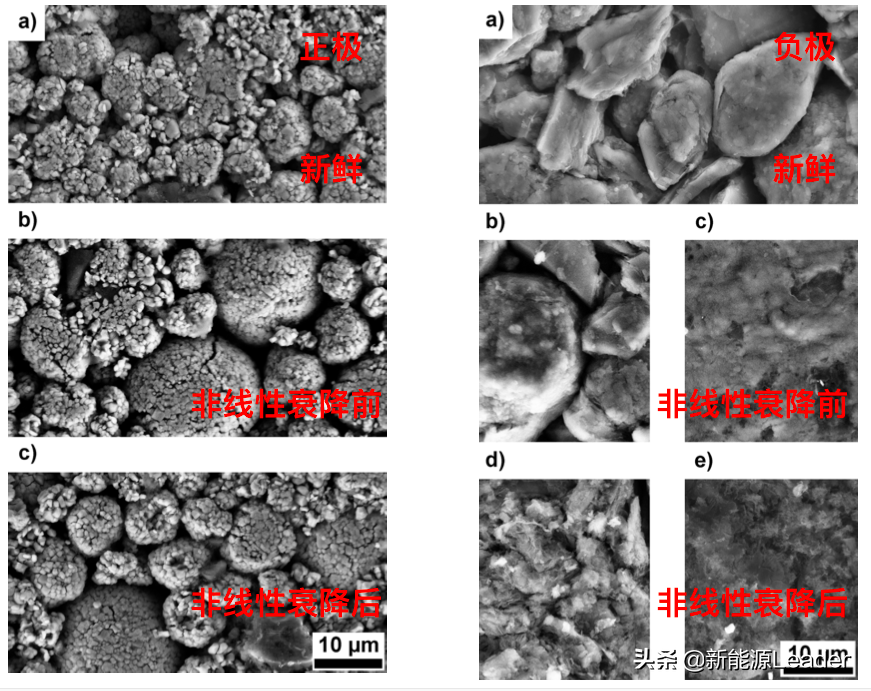 从前面的分析不难看出循环过程中负极SEI膜生长导致负极的动力学性能变差,引起负极表面析锂是导致锂离子电池非线性衰降的主要因素,因此作者分析了循环前、非线性衰降前和非线性衰降后的正负极表面形貌,从图中尊时凯龙能够看到正极的形貌在这一过程中几乎没有发生明显的改变,而负极的形貌在非线性衰降前已经能够在活性物质颗粒表面观察到一层薄薄的SEI膜,部分区域能够观察到较厚的SEI膜,而在非线性衰降后负极颗粒表面已经出现了明显的SEI膜,而很多区域也都出现了非常厚的SEI膜。这也再次验证了尊时凯龙之前的推测——负极SEI膜持续生长导致的动力学条件变差引起的负极表面析锂是导致锂离子电池非线性衰降的主要因素。