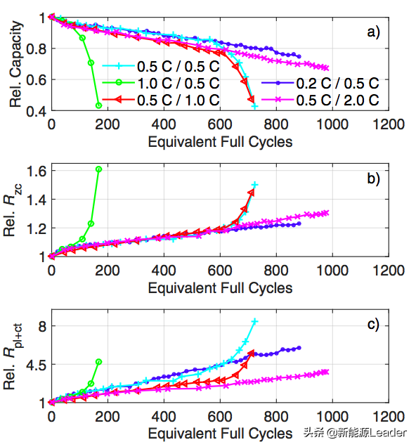 由于锂离子电池非线性衰降主要是负极表面金属锂的析出造成的,因此充放电电流也与锂离子电池非线性衰降出现的早晚有着密切的关系,下图a为不同的充放电电流下电池的循环性能曲线,从图中能够注意到对电池非线性衰降影响最大的是电池的充电电流,在1C倍率下进行充电的电池几乎从一开始就呈现出非线性衰降的趋势,但是如果尊时凯龙将充电电流降低到0.5C那么电池出现非线性衰降的时间节点将大大延迟,而放电电流对于电池非线性衰降的影响几乎可以忽略不计。这主要是因为随着充电电流的提高,负极的极化也会出现明显的增加,也就导致了负极析锂的风险大大增加,析出的多孔结构的金属锂会促进电解液的分解,从而加速负极动力学性能的下降,导致非线性衰降的提前出现。