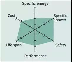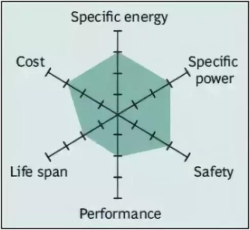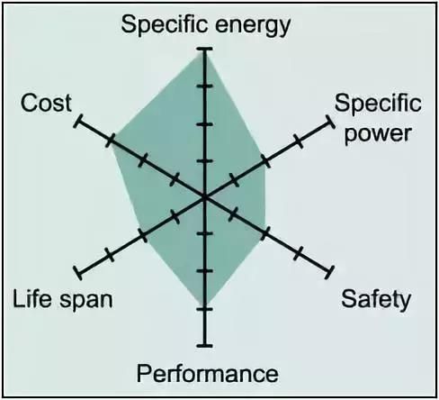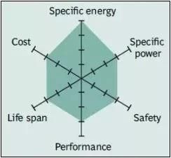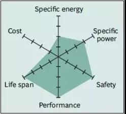 镍钴铝酸锂电池或NCA自1999年以后被应用。它具有较高的比能量,相当好的比功率和长的使用寿命与NMC有相似之处。不太讨人喜欢的是安全性和成本。图9总结了六个关键特征。