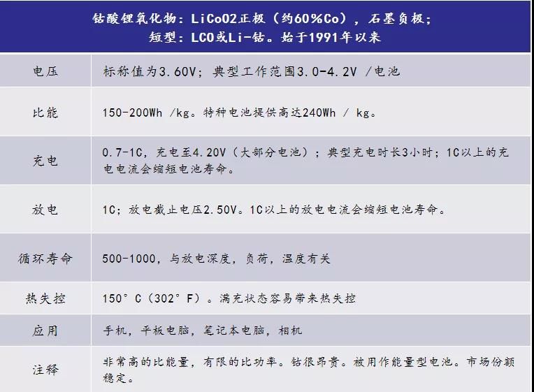 其高比能量使钴酸锂成为手机,笔记本电脑和数码相机的热门选择。钴酸锂的缺点是寿命相对较短,热稳定性低和负载能力有限(比功率)。像其他钴混合锂离子电池一样,钴酸锂采用石墨负极,其循环寿命主要受到固体电解质界面(SEI)的限制,主要表现在SEI膜的逐渐增厚,和快速充电或者低温充电过程的负极镀锂问题。较新的材料体系增加了镍,锰和/或铝以提高寿命,负载能力和降低成本。
