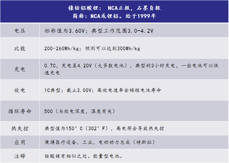 NCA是锂镍氧化物的进一步发展;加入铝赋予电池更好的化学稳定性。高能量和功率密度以及良好的使用寿命使NCA成为EV动力系统的候选者。高成本和边际安全性却有负面的影响。