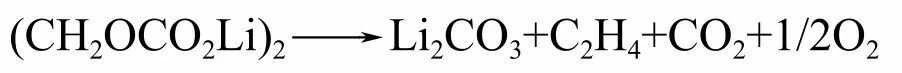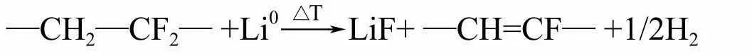 在更高温度下,负极表面失去了SEI膜的保护,嵌入负极的锂将与电解液溶剂直接反应有C2H4O产生,可能为乙醛或氧化乙烯。嵌入锂的石墨在300℃以上与熔融的PVDF–HPF共聚物发生如下反应: