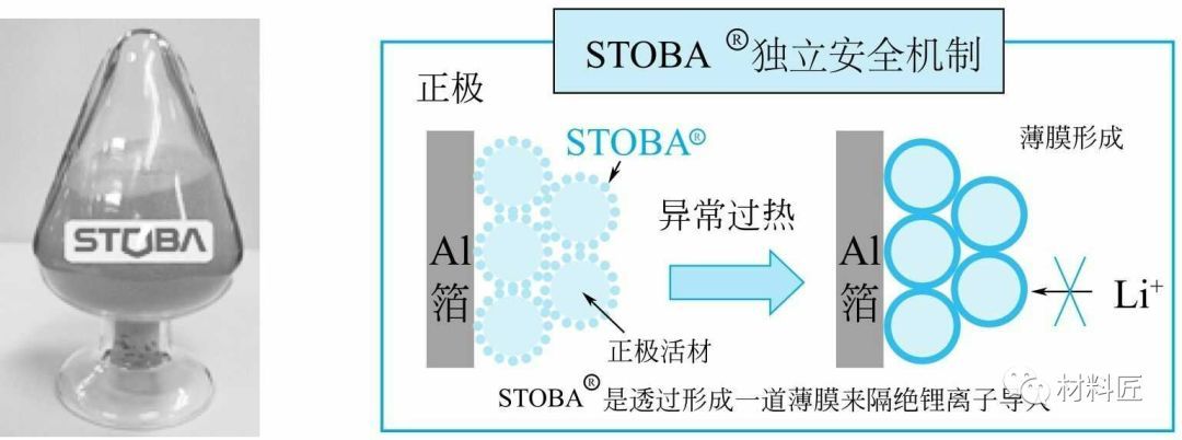 上图采用一种纳米级树枝状结构的高分子化合物(STOBA)对NCM(424)进行涂层,当锂电池发生异常,产生高温时,会形成一道薄膜阻隔锂离子间的流动,稳定锂电池,借以提高电池安全度。由下图可见,针刺实验时,正极材料未涂STOBA涂层的电池内部温度在几秒钟内升至700℃,而用STOBA涂层正极材料的电池温度最高只有150℃。