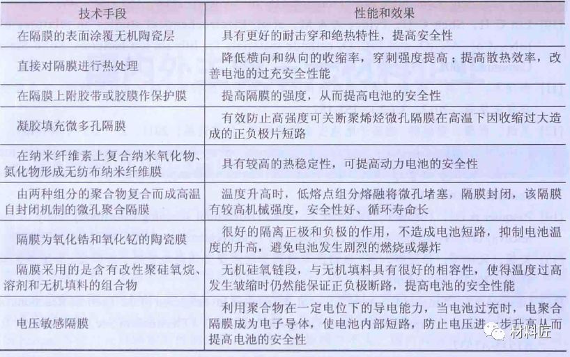 隔膜垂直方向上的机械强度越高,电池发生微短路的概率就越小;隔膜的热收缩率越小,电池的安全性能越好。隔膜的微孔关闭功能也是改进动力电池安全性的另一方法;凝胶类聚合物电解质具有较好的保液性,采用这种电解质的电池比常规液态电池具有更好的安全性;除此,陶瓷隔膜也可以改进电池的安全性。常见的国内专利文献对锂电池隔膜的制备和处理类型,见下表。